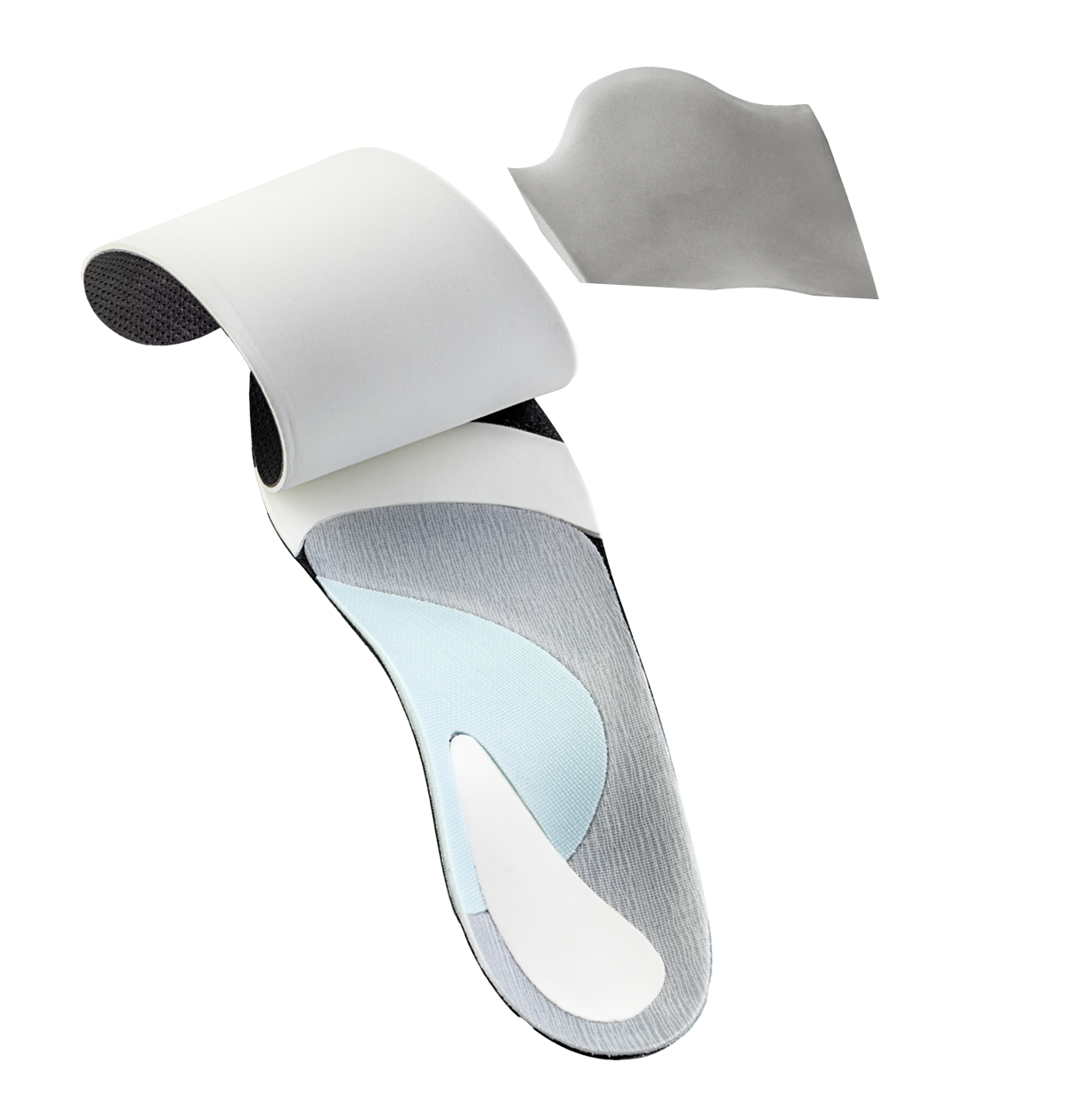 Plantilla a medida con base de resina y con elemento adaptable. Consta de un refuerzo en la zona de arco longitudinal interno y descarga de EVA en la zona de cabeza de metatarsianos